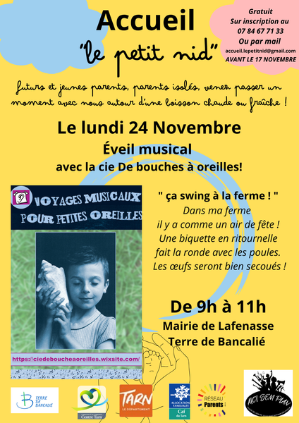 Pour la prochaine rencontre du « Petit Nid », les organisatrices vous proposent de l’éveil musical avec la Compagnie De bouches à oreilles! suivi d’un temps de partage.